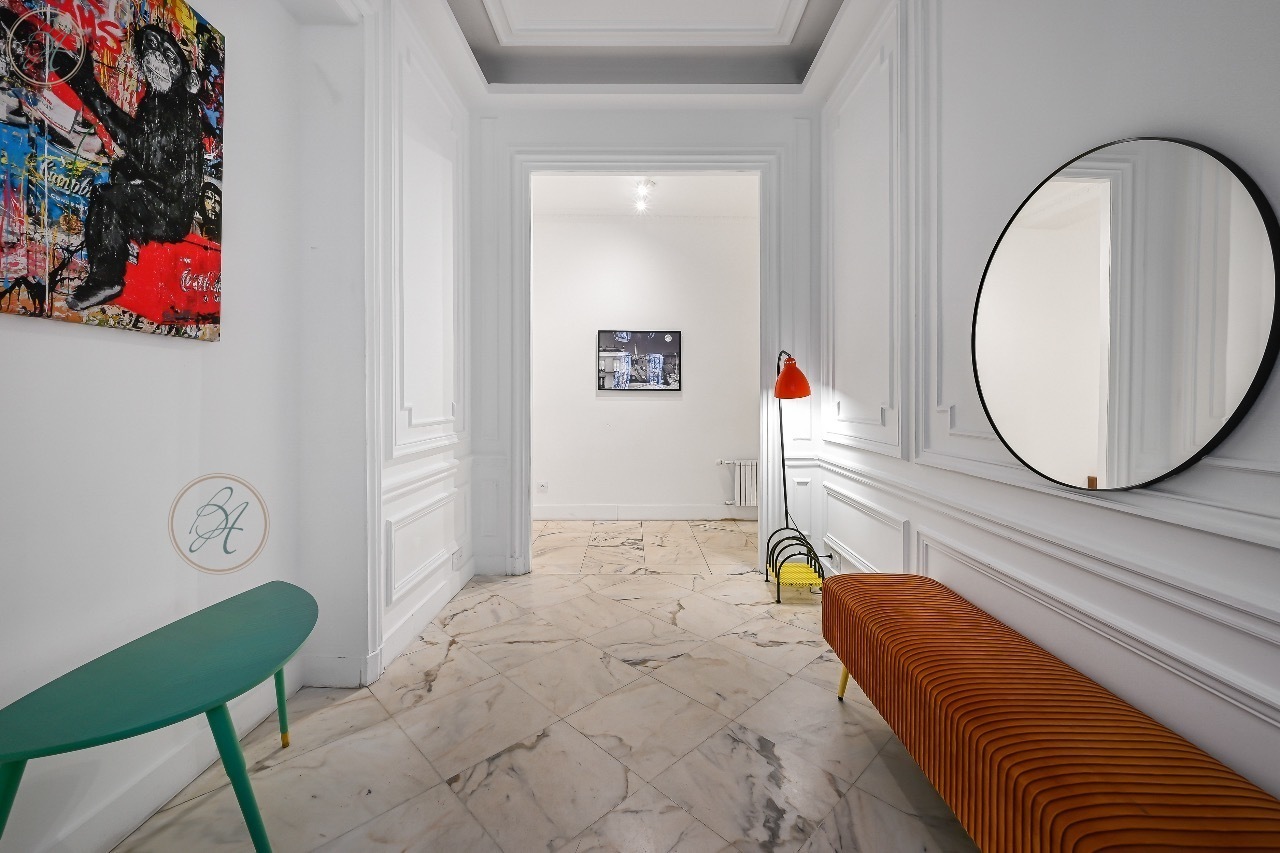 Située dans un bel immeuble 1900 de standing, vous apprécierez sa fraicheur l'été, sa hauteur de plafond de 3,10m, le charme de l'ancien revisité avec modernité et goût : sol en marbre et parquets, éclairages en corniche, jolie cheminée en pierre, fenêtres hautes.