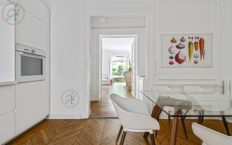 D' une entrée qui dessert sur la gauche une grande cuisine dinatoire qui donne sur un salon en parquet Point de Hongrie spacieux avec sa cheminée et ses grandes fenêtres qui ouvrent sur une terrasse végétalisée avec une exposition Ouest (soleil dès 15h).