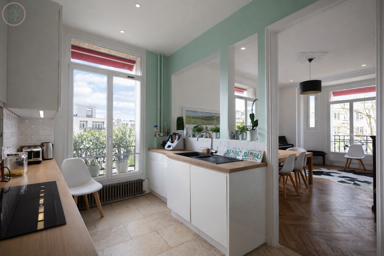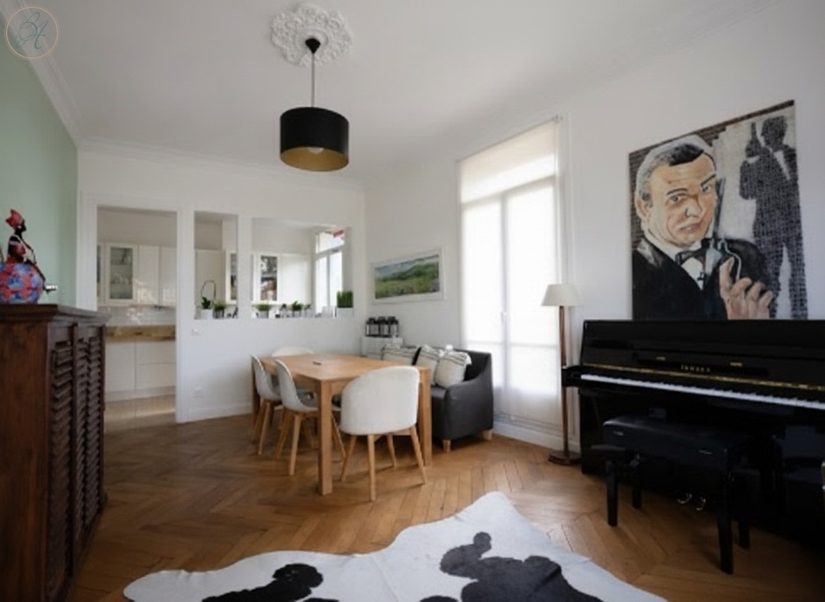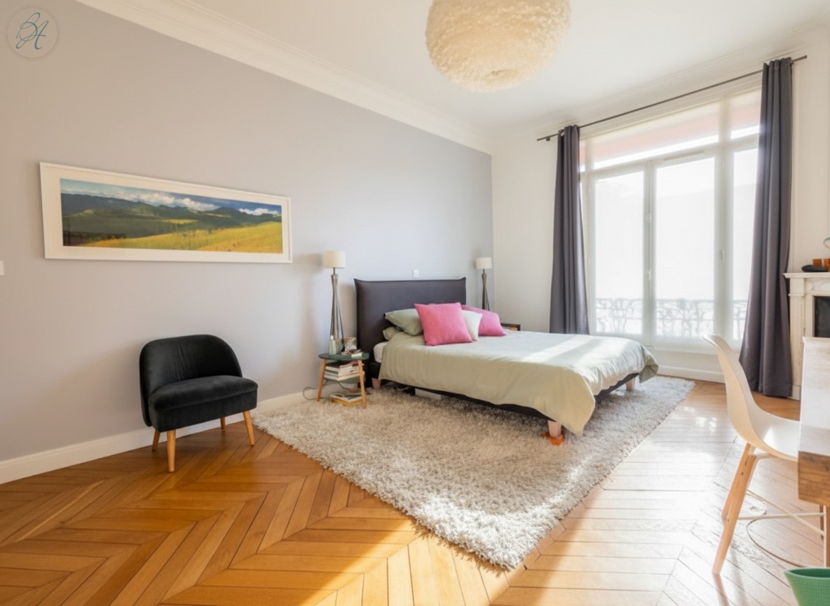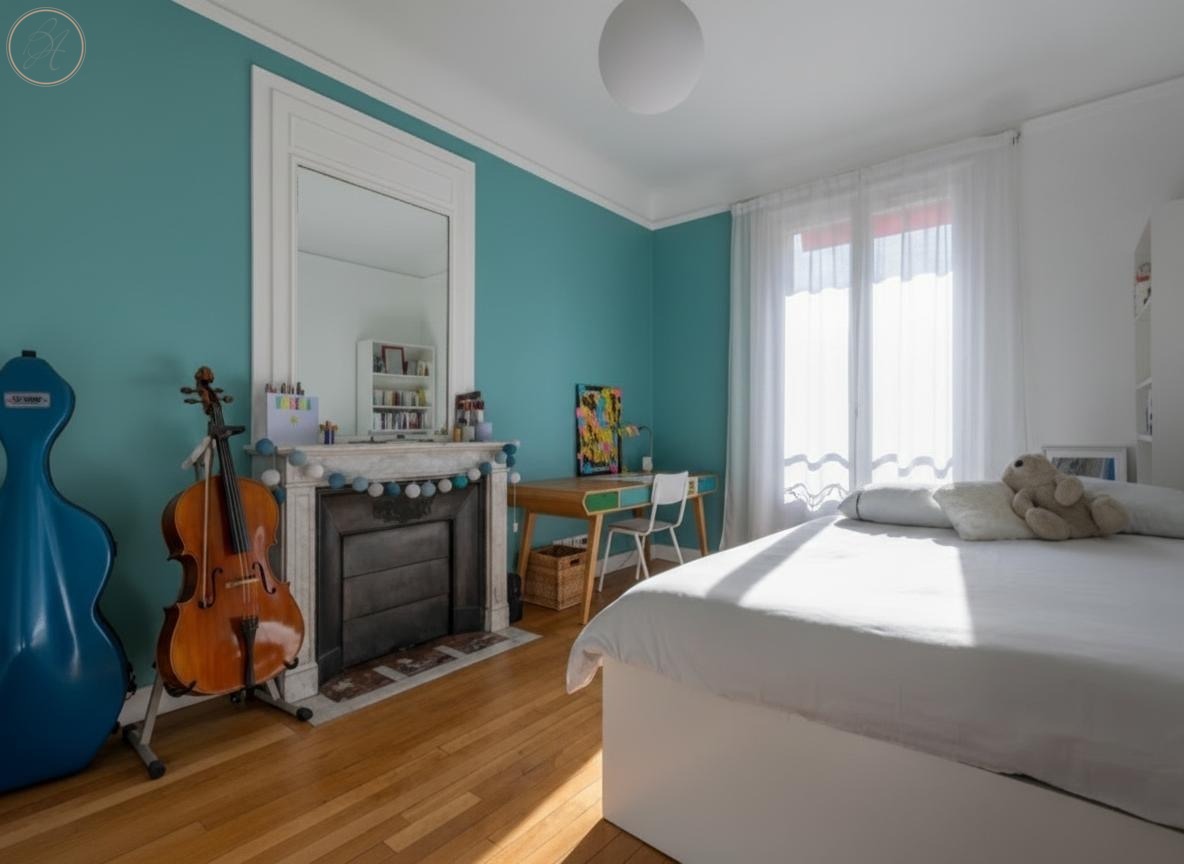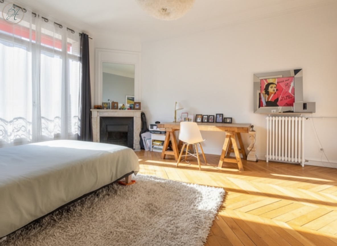 Les volumes généreux et les éléments de caractère — parquet ancien, cheminées (celle du salon est en état de marche) et une hauteur sous plafond de 3,30 m — confèrent à cet appartement un cachet rare.