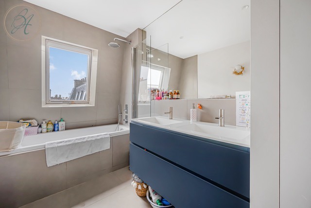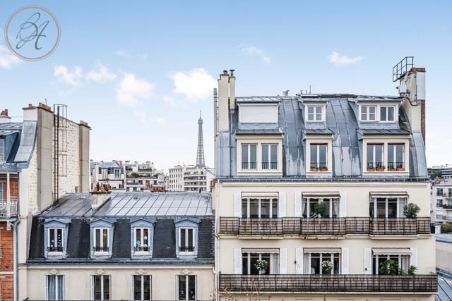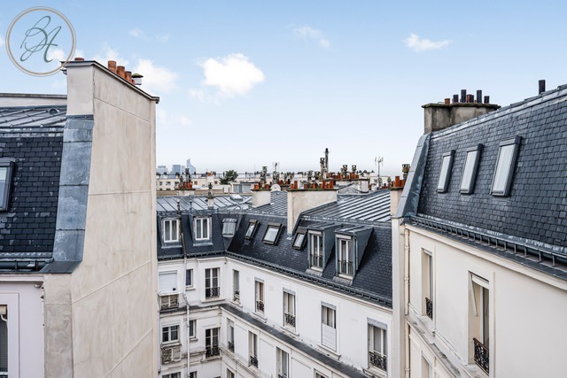 Les vues sont particulièrement séduisantes : depuis le séjour, une perspective dégagée avec un aperçu Tour Eiffel ; à l’opposé, de superbes panoramas sur les toits parisiens. Une atmosphère ouverte et typiquement parisienne.
