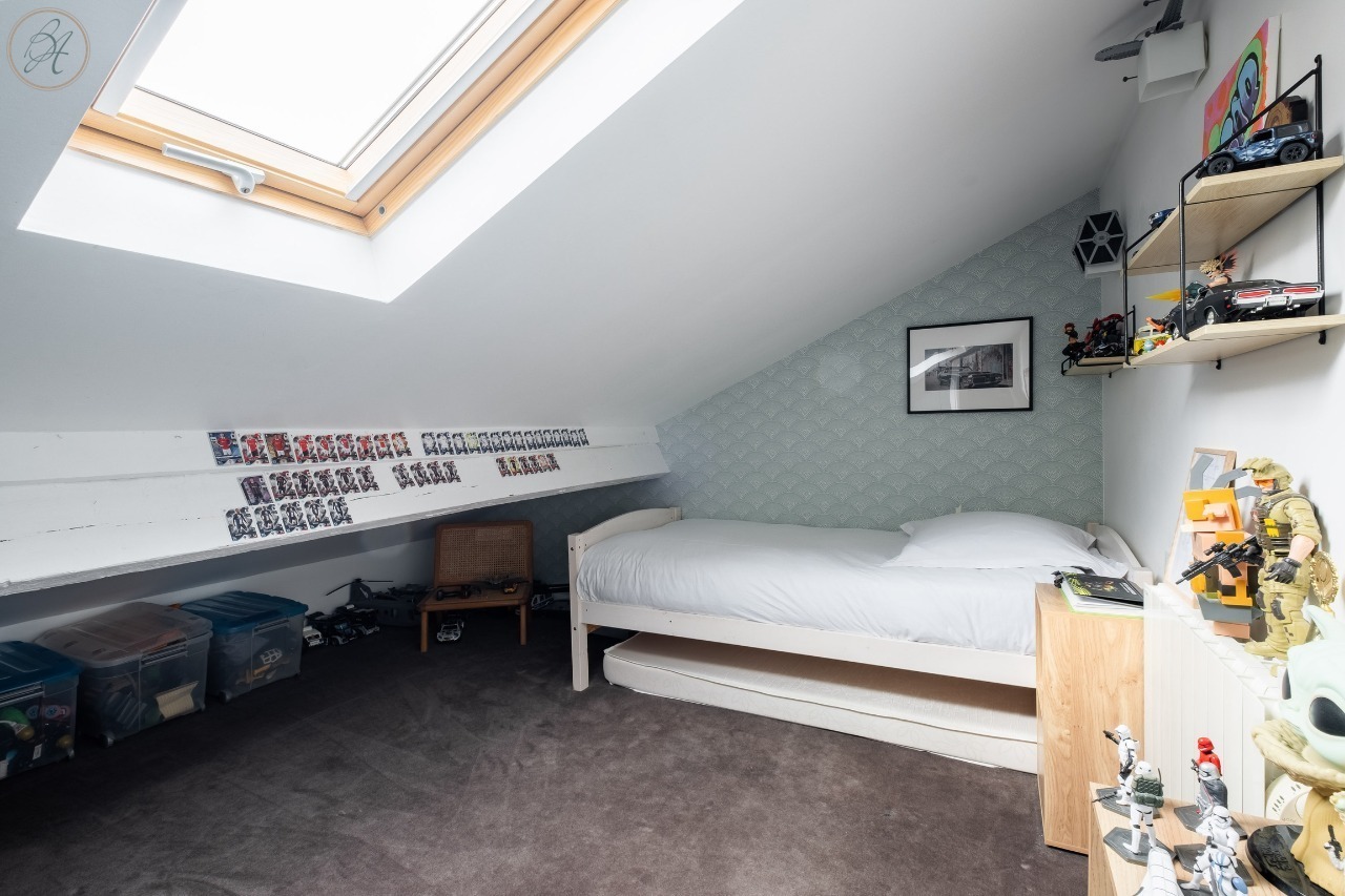 À l’étage supérieur, l’espace enfants propose deux chambres mansardées, un petit lavabo et un WC. Cet ensemble peut convenir à deux jeunes enfants ou constituer un grand espace privatif pour un seul, combinant chambre, zone de jeu ou de travail, rangements et coin toilette.