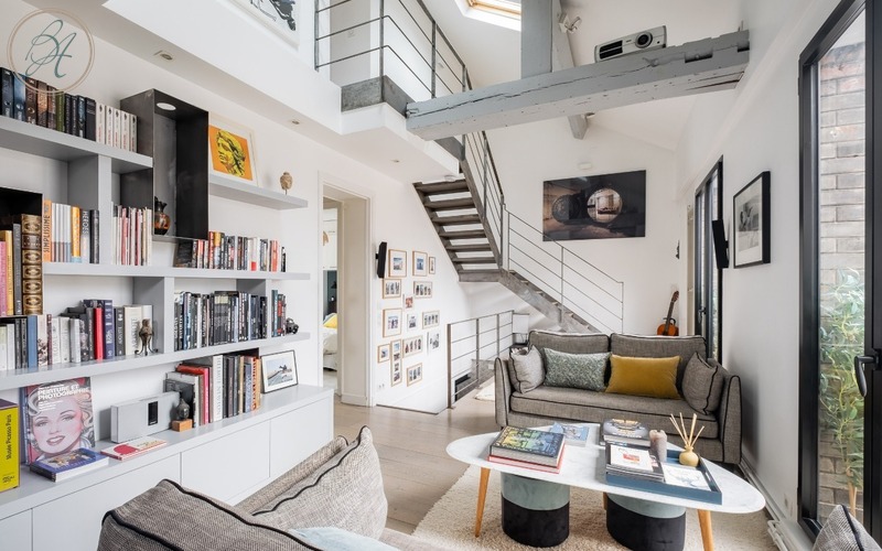 L’étage principal accueille une entrée avec rangements, une vaste réception baignée de lumière, une grande cuisine dinatoire, ainsi qu’un espace bureau en hauteur accessible par une échelle.